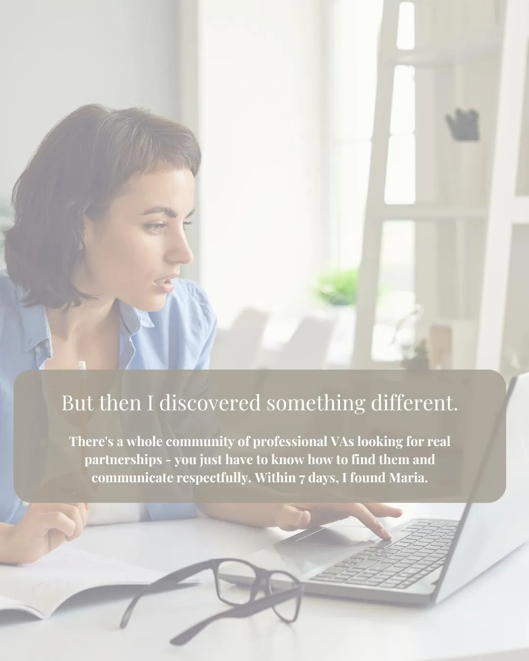 Remember, every day you continue doing everything yourself is another day you're not growing your business. Your perfect VA is out there right now, looking for someone exactly like you to work with. Don't let someone else hire them first.